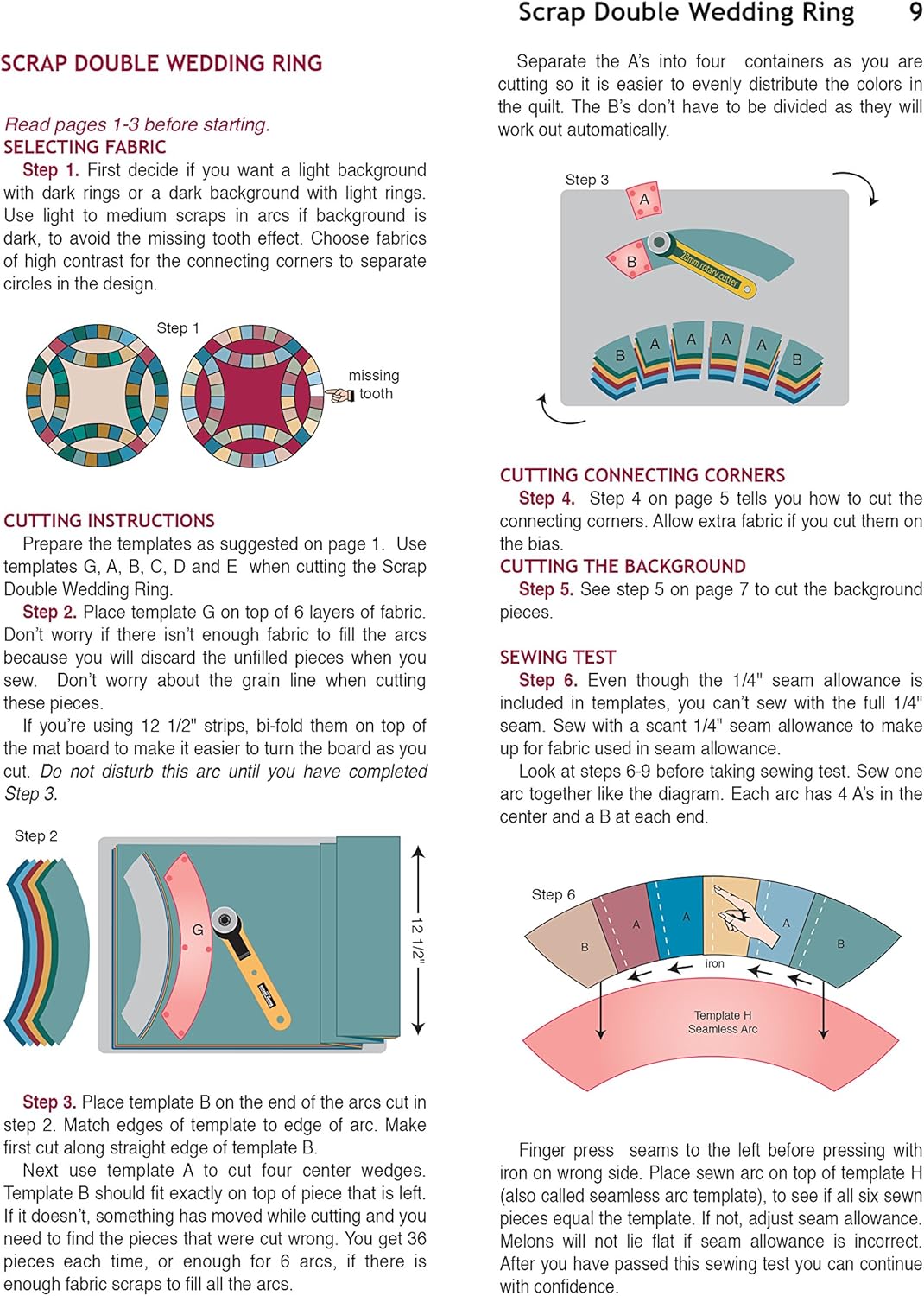 This book includes 8 acrylic templates & 25 pages with easy to follow graphics in color, cover to cover. A complete materials list, help with fabric selection & yardage chart are included. Now you can cut Seamless Arc, Planned or Scrap variations of Double Wedding Ring for a queen size quilt in an afternoon. Shar tells you exactly what to do with remarkable accuracy every stitch of the way. The pattern makes 15 inch circles. Shar was nominated Minnesota Quilter of the Year in 2009.