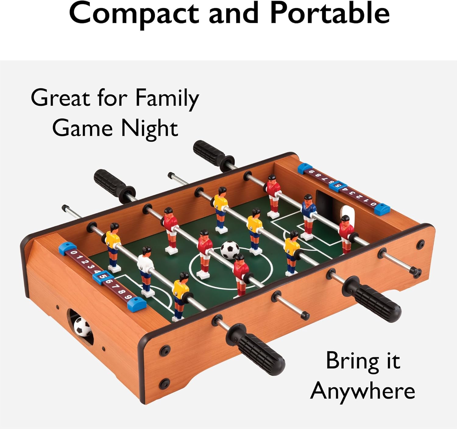 Product Description The Mainstreet Classics 20-Inch Table Top Foosball Game creates all the fun of foosball, without taking up nearly as much space and without breaking the bank. Its compact size enables easy storage as well as portability for condensed fun anywhere with a table or flat surface. The table topper has four rows of players, with three players per row, this includes a goalkeeper on each side that have different-colored jerseys. The Mainstreet Classics 20-Inch Table Top Foosball Game includes two "soccer style" foosball balls, two manual sliders for keeping score, and dual-end ball returns. Dimensions: 20" L x 12-1/2" W x 4" D. Amazon.com Enjoy a fast-paced foosball battle without buying a space-consuming full-size table with the Mainstreet Classics tabletop version. The game offers all the thrills of traditional foosball--including pull shots, rollovers, and pull kicks--but is small enough to bring to parties or BBQs. Designed to look and feel like a genuine table, the game boasts such features as a medium-wood construction to withstand wear and tear, four steel rods, six robot players per side, a classic slide scorer, and two soccer designed foosballs. And when you're done playing, the game stores easily in a closet or under a bed. The tabletop foosball game measures 20 by 4 by 12.5 inches (W x H x D).