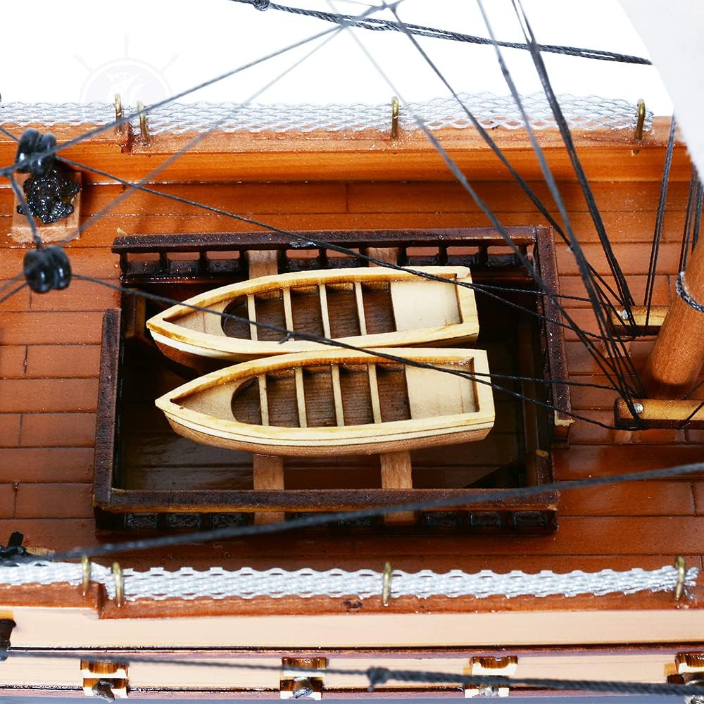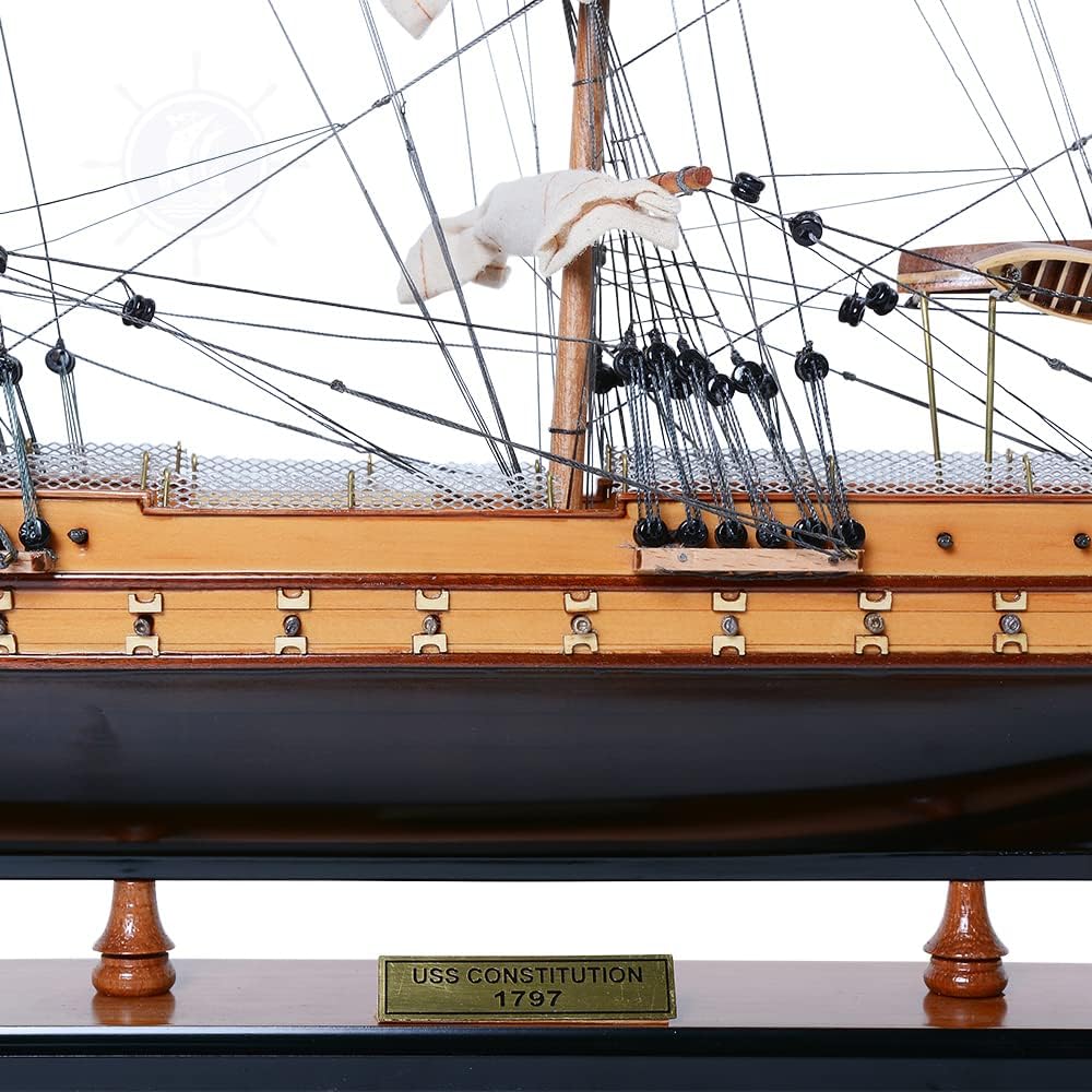 The U.S.S. Constitution, a three-mast frigate, is the world's oldest commissioned warship. Our model is handcrafted from beautiful wood such as rosewood, mahogany, teak, and along with various other exotic wood. The hull is constructed using a plank on frame method, each strip of exotic wood are carefully join together to form a smooth hull. This model is completely hand built to spec by skillful and creative master craftsmen; you will be amazed at how real it looks. The ship has a clear varnished coating follow with amazing details. On the ship, you will spot amazing details such as: wooden bowsprit, foremast, mainmast, and mizzen mast. They are all connected to numerous fabric sails with detailed stitching, all rigging are painstakingly fastened by hand in matching colors. There's a small wooden cabin with a wooden boat on the main deck. On the quarter deck, there's a wooden cabin. There are wooden fences surrounding the beakdeck area toward the quarter deck area. You can easily spot a large number of metal cannons on both side of the hull, and other crafted metal parts on the front and back of the ship. There's also a wooden rudder to help the ship maneuver in the right direction. An attached wooden stand with a nameplate engraved "USS constitution" is standard on this model. Our model was built according to scale through original plans, pictures and drawings. We absolutely use no plastic parts only the highest quality wood and metal parts. This model is carefully secure and packed inside a wooden crate for easy shipping purposes. Our HMS victory model comes fully-assembled and ready to be display.