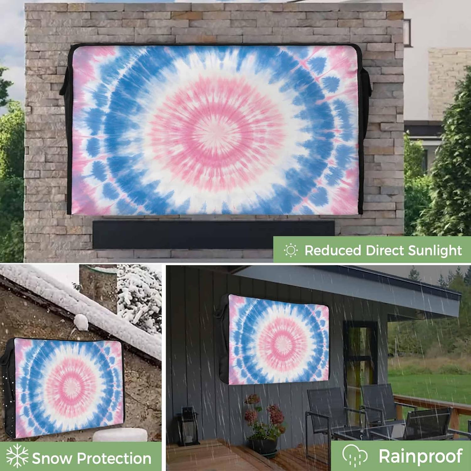 A Great Weatherproof Tv Cover / Weatherproof Tv Box for Your TVProduct DescriptionMaterial: Durable Oxford 600D fabric & PVC coated interiorSize Dimensions: 30"x19"x4.5" fit for 30" - 32" TV Screen38"x24"x4.5" fit for 36" - 39" TV Screen40"x25"x4.5" fit for 40" - 43." TV Screen48"x30"x4.5" fit for 48" - 50" TV Screen52"x30"x4.5" fit for 52" - 55" TV Screen58"x37"x4.5" fit for 60" - 65" TV Screen68"x42"x4.5" fit for 70" - 75" TV Screen75"x45"x4.5" fit for 80" - 85" TV ScreenExquisite WorkmanshipThe outdoor tv cover with nice edges, very smooth, and the seam edges are sturdy and firm to keep its shape. This cover is designed with thick and durable material, which makes it dust-proof,water-proof, weatherproof, anti-UV and resistant to wear.Portable Pocket Storage DesignThis tv covers outdoor features pockets on the left and right sides, the perfect space for remote controls and storage for other items! When you're ready to turn off the TV and go indoors, remember to store the remote in the case pocket.Vibrant Pattern & Perfect GiftOur TV display protectors come in a variety of vibrant colors and patterns for each season and occasion. A thoughtful home gift for mother, wife and friends. Give your space a real personality, the perfect gift for various holidays. Special NoteBoth machine and hand washable with gentle cycle and lay flat to dry, no bleach, iron on low heat if required.Please measure your tv screen size prior to purchasing to ensure the best fit.