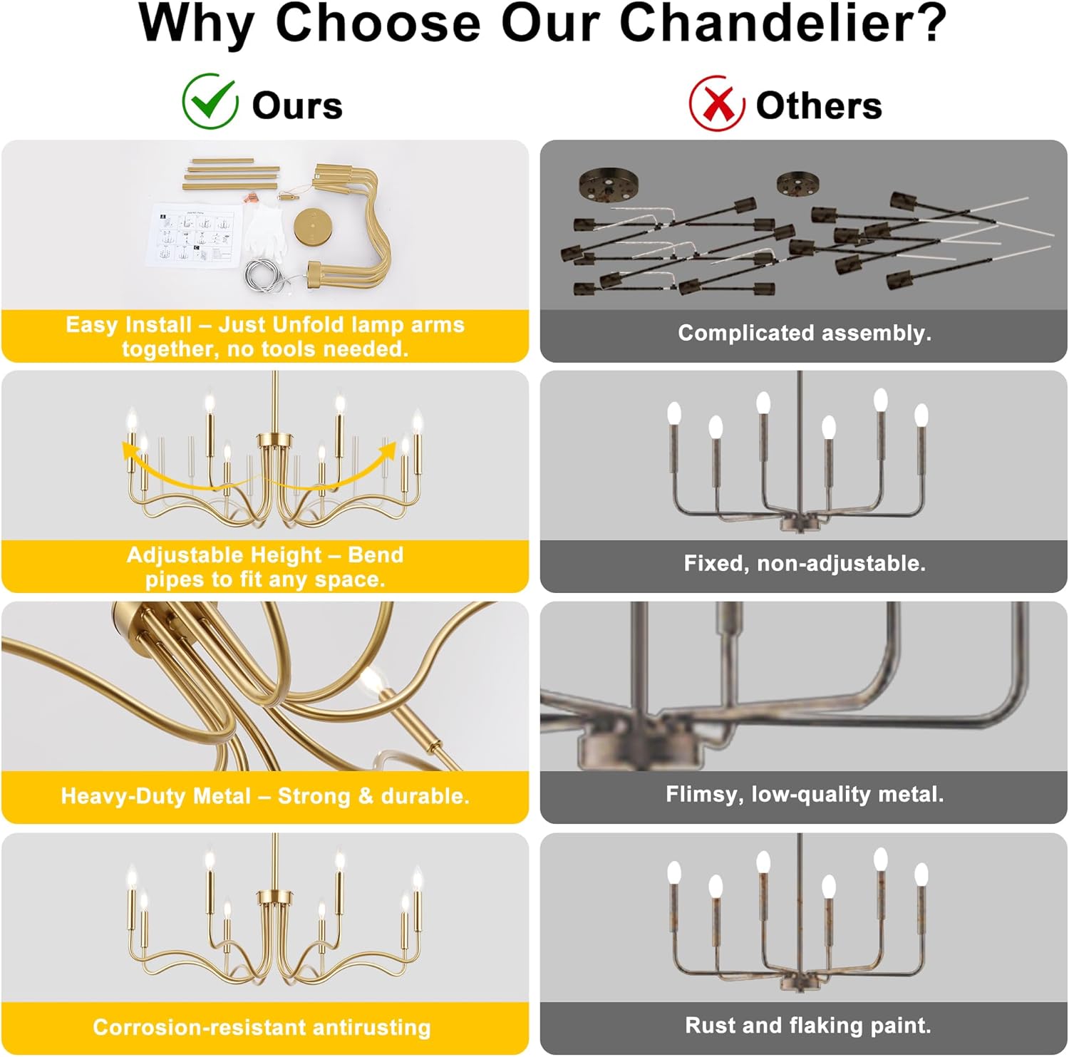 | Included Components | 8 light gold chandelier x 1, Assembly Kit x 1, Instruction Manual |